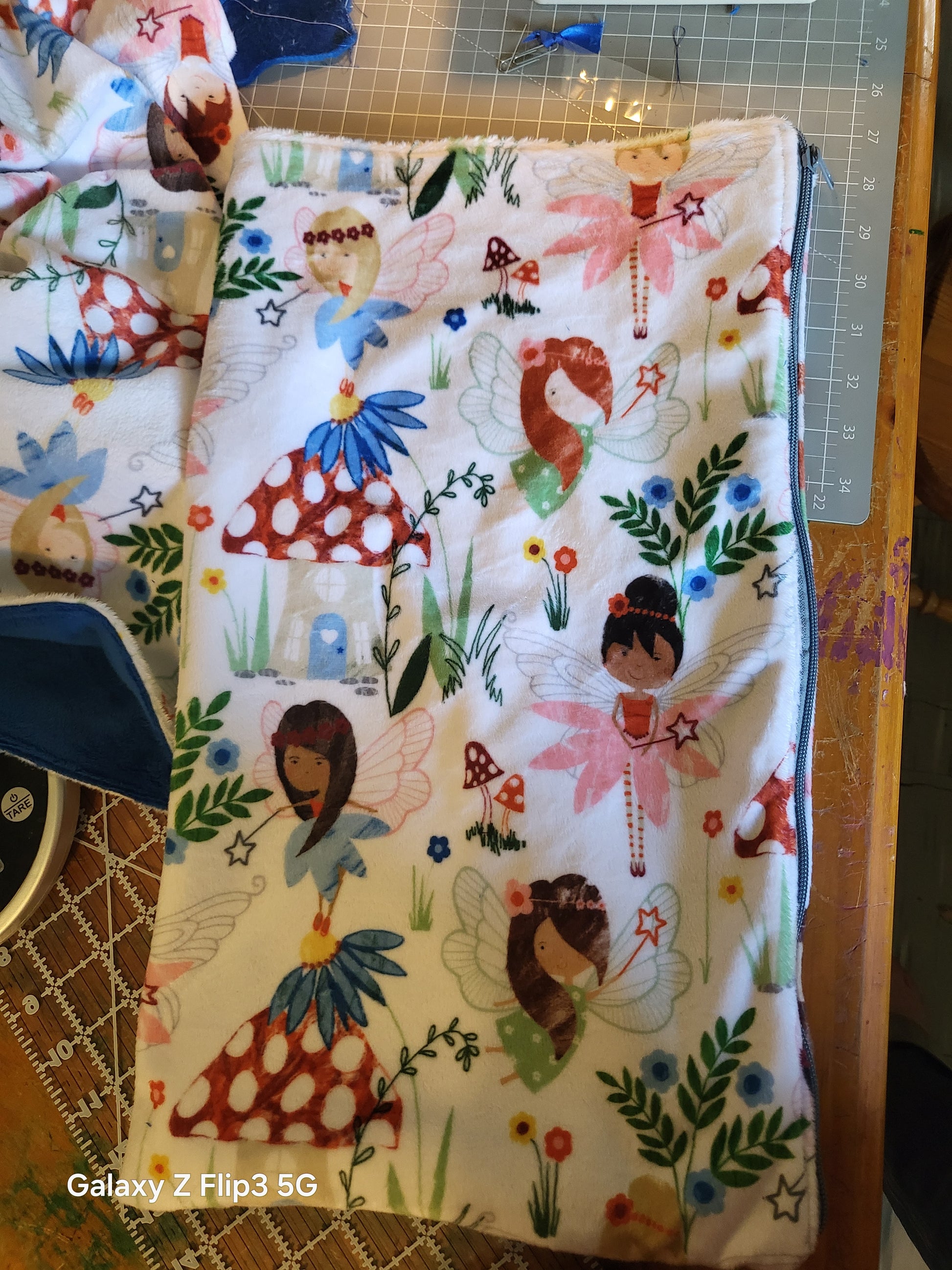 - Pixie & Royal Blue Doll Sleeping Bag, featuring whimsical fairy garden prints and soft minky lining with a handy side zipper